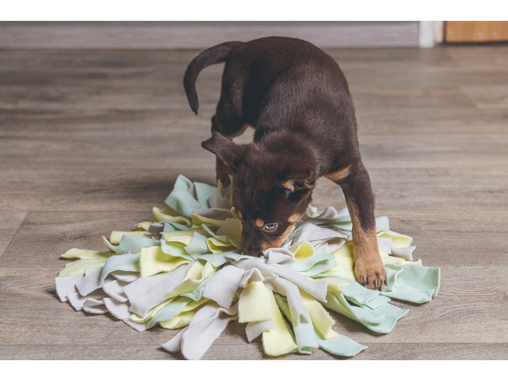 Čmuchací kobereček nabízí Vašemu štěńátku spoustu výzev. Můžete ho použít k ukrytí psích sušenek nebo jiných pamlsků. Podložka se skládá z různých barevných provázků, krátkých i dlouhých. Díky této struktuře bude muset štěňátko vynaložit velké úsilí, aby pamlsky našlo, což ho smysluplně zaměstná na dlouhou dobu. Kobereček je vyroben z měkkého flísu, takže je pro čumáček Vašeho štěněte velice příjemný.