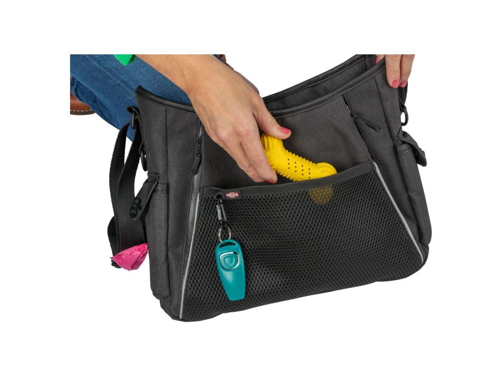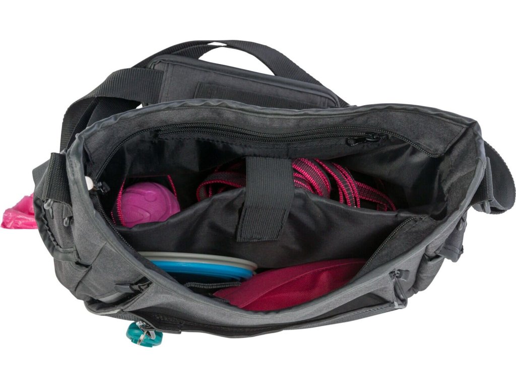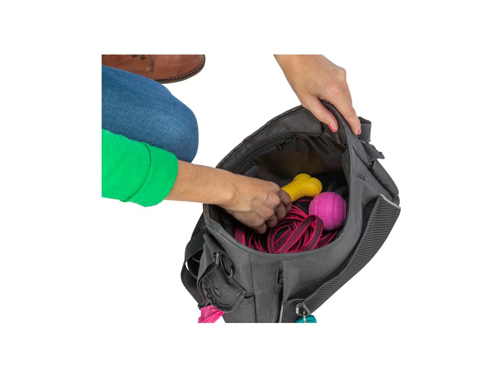 Díky promyšlenému členění nabízí taška dostatek prostoru pro výcvikové pomůcky, pamlsky, vodítko i drobnosti na cestování se psem – bez chaosu a hledání.