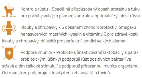 SUPERPRÉMIOVÉ HYPOALERGENNÍ KRMIVO OBSAHUJÍCÍ JEDINÝ ZDROJ ŽIVOČIŠNÉHO PROTEINU URČENÉ PRO ZDRAVÝ VÝVOJ A PODPORU IMUNITY ŠTĚŇAT VELKÝCH PLEMEN. VYBRANÉ ZDROJE PROTEINŮ SE ŘADÍ MEZI NEALERGENÍ PROTEINY, KTERÉ MINIMALIZUJÍ RIZIKO ALERGICKÝCH REAKCÍ. ZEJMÉNA VHODNÉ PRO PSY S CITLIVÝM TRÁVENÍM, PSY, KTERÝM NEVYHOVUJÍ BĚŽNÁ KRMIVA A PSY, U KTERÝCH JE VYŠŠÍ POTENCIÁL ROZVINUTÍ POTRAVNÍ ALERGIE. RECEPTURY JSOU OBOHACENY O PROBIOTIKA PRO SPRÁVNOU ROVNOVÁHU STŘEVNÍ MIKROFLÓRY PRO PODPORU IMUNITY ŠTĚNĚTE VELKÉHO PLEMENE.