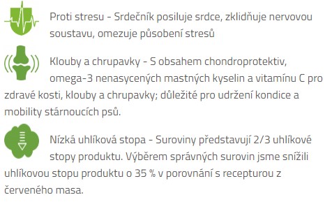 SUPERPRÉMIOVÉ A UDRŽITELNÉ KRMIVO ŠETRNÉ K PŘÍRODĚ URČENÉ PRO ZDRAVÉ TRÁVENÍ, ZMÍRNĚNÍ STRESU, ZLEPŠENÍ KONDICE A PODPORU IMUNITY VHODNÉ PRO SENIORY VŠECH PLEMEN. OBSAHUJE LEHCE STRAVITELNÉ A NUTRIČNĚ HODNOTNÉ BÍLKOVINY S KOMPLETNÍM OBSAHEM AMINOKYSELIN PRO SKVĚLOU KONDICI SVALŮ A TKÁNÍ. BEZLEPKOVÉ SLOŽENÍ JE VHODNÉ PRO VŠECHNY PSY BEZ RIZIKA PŘIBÍRÁNÍ NAVÁZE. RECEPTURA ŠETRNÁ K PŘÍRODĚ VYROBENÁ Z EKOLOGICKÝCH PROTEINŮ A UDRŽITELNÝCH SUROVIN MÁ O 35% NIŽŠÍ DOPAD NA ŽIVOTNÍ PROSTŘEDÍ.