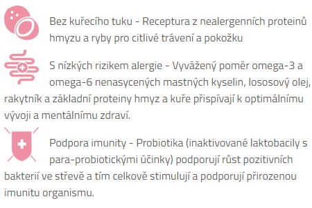 SUPERPRÉMIOVÉ A UDRŽITELNÉ KRMIVO ŠETRNÉ K PŘÍRODĚ JE SPECIÁLNĚ NAVRŽENÉ PRO PSY S CITLIVOU POKOŽKOU. VYSOKÝ OBSAH OMEGA-3 A OMEGA-6 NENASYCENÝCH MASTNÝCH KYSELIN UDRŽUJE LESK A HUSTOTU SRSTI A ZDRAVÍ POKOŽKY. ZMÍRŇUJE PROJEVY ZÁNĚTŮ, SUCHÉ POKOŽKY A ZACUCHÁVÁNÍ SRSTI. UDRŽUJE SRST HLADKOU A LESKLOU. KOMBINACE PROTEINU Z HMYZU A RYB MÁ VYNIKAJÍCÍ NUTRIČNÍ VLASTNOSTI, SNIŽUJE RIZIKO POTRAVNÍCH ALERGIÍ A JE VHODNÁ PRO PSY S POTRAVNÍ CITLIVOSTÍ. PROTEIN Z HMYZU MÁ VÝRAZNĚ NIŽŠÍ EKOLOGICKOU ZÁTĚŽ V POROVNÁNÍ S BĚŽNÝM PROTEINEM.
