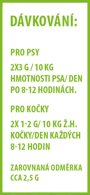Krmný návod: přípravek se podává zamíchaný do krmiva dle doporučeného dávkování dlouhodobě. Při zánětech a otravách můžete zvýšit dávku až na čtyřnásobek.