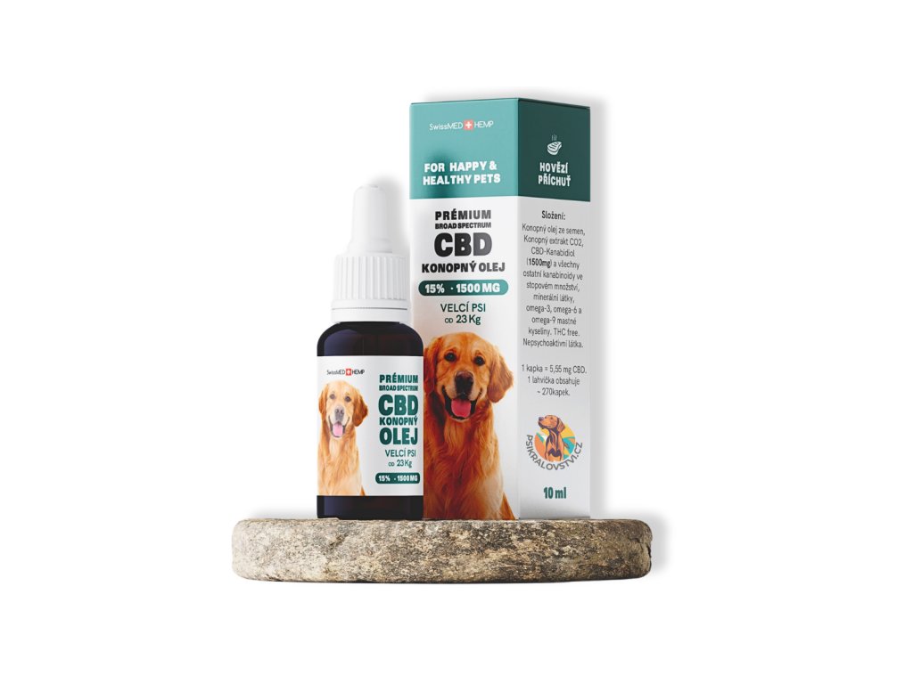 Prémiový širokospektrální CBD konopný olej s hovězí příchutí pro velké psy od 23 kg.