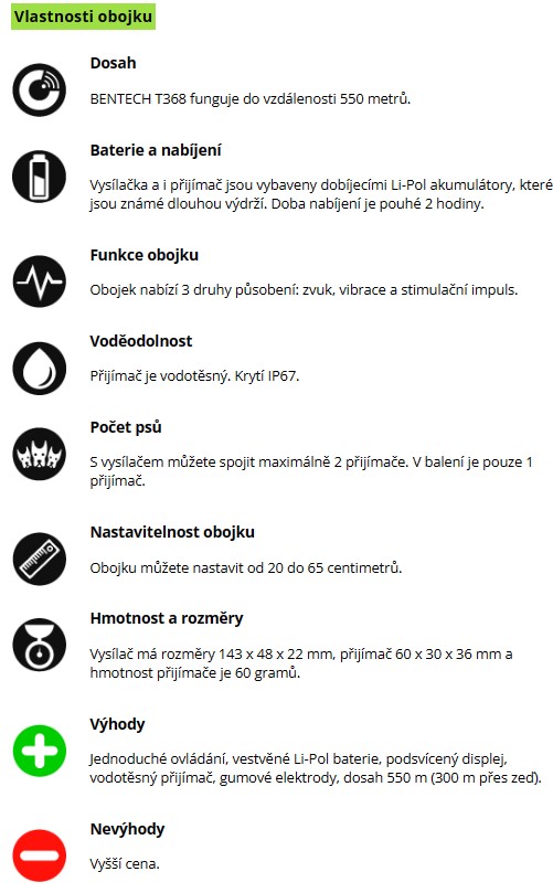 Obojek BENTECH T368 zajistí kvalitní výcvik pro všechny typy psů. Na obojku lze využít impuls nebo vibrace, a přizpůsobit tak jeho funkčnost citlivosti psa. Zároveň lze nastavit pro oba parametry intenzitu v rozsahu až 100, přičemž nastavení je pro každý parametr zvlášť. Vlastní tlačítko každé funkce pak umožní pohotové reakce.