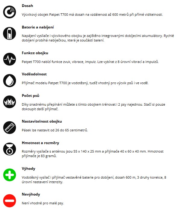Maximální dosah je 600 metrů. Obojek disponuje třemi druhy korekcí - zvuk, vibrace a impulzy, s tím, že je možné si zvolit intenzitu až z 8 úrovní. Výcvikový obojek Patpet T700 je dobíjecí obojek, jehož další funkcí je rychlonabíjení pomocí nabíječky, která je součástí balení. Obojek je vhodný pro malé, střední i velké psy.