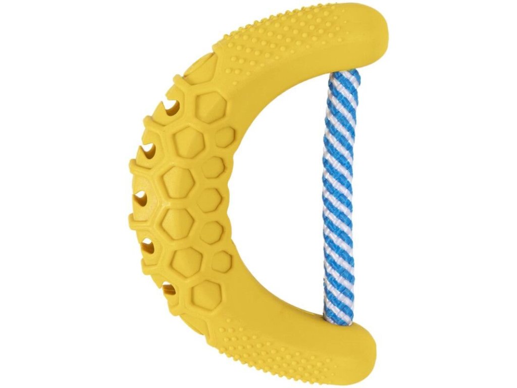 Žvýkací hračka ve tvaru banánu. S vroubky a drážkami, které při žvýkání masírují dásně, čistí zuby a také umožňují schování pochoutek nebo zubní pasty. Velikost 13,5 cm.