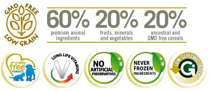 Čerstvé vykostěné kuře (24%), sušené kuřecí maso (24%), pšenice špalda (10%), oves (10%), kuřecí tuk, sušená celá vejce, čerstvý herring, sušený herring, rybí olej, hydrolyzované živočišné bílkoviny, sušená dřeň z červené řepy, vláknina z hrášku, sušené mrkve, sušená vojtěška, inulin, fruktooligosacharidy, mannanoligosacharidy, prášek z granátových jablek (0,5%), sušená jablka, prášek ze špenátu, psyllium (0,3%), prášek z černého rybízu (0,3%), prášek z borůvek, chlorid sodný, sušené pivovarské kvasnice, kořen kurkumy (0,2%), glukosamin, chondroitin sulfát, extrakt z afrikánu (zdroj luteinu), extrakt ze zeleného čaje, aloe vera, zrníček hroznů a rozmarýnu.