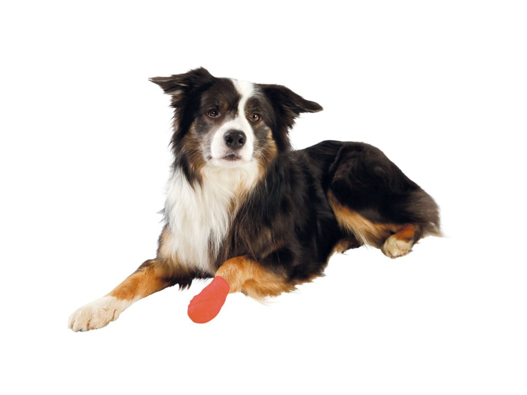 Bandáž je pružná, dobře se přizpůsobí tvaru tlapky či končetiny a pomáhá chránit ránu před nečistotami, vlhkostí i okusováním.