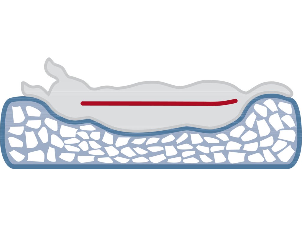 Pro ležící prostor pelechu byl zvolen ortopedický přístup. Oboustranný polštář, který je součástí pelechu, je naplněn viscoelastickými pěnovými vločkami, známými též jako paměťová pěna. Tyto vločky reagují na tělesné teplo psa a tak mu zajistí přizpůsobenou oporu.
