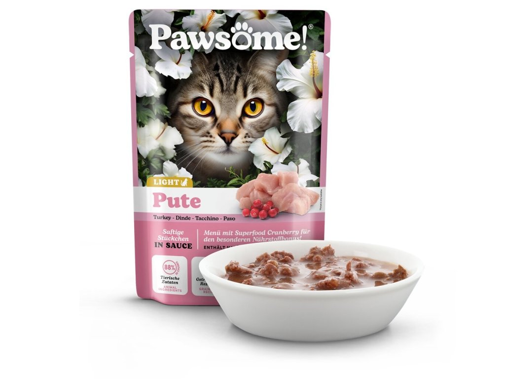 Kapsička pro kočku Pawsome představuje šťavnaté krůtí kousky se sušenými brusinkami v lahodné omáčce. Kompletní krmivo se sníženým obsahem kalorií, obohaceno o taurin a čekankový inulin. Vhodné pro dospělé kočky s nižšími energetickými nároky. Neobsahuje obiloviny ani přidaný cukr.