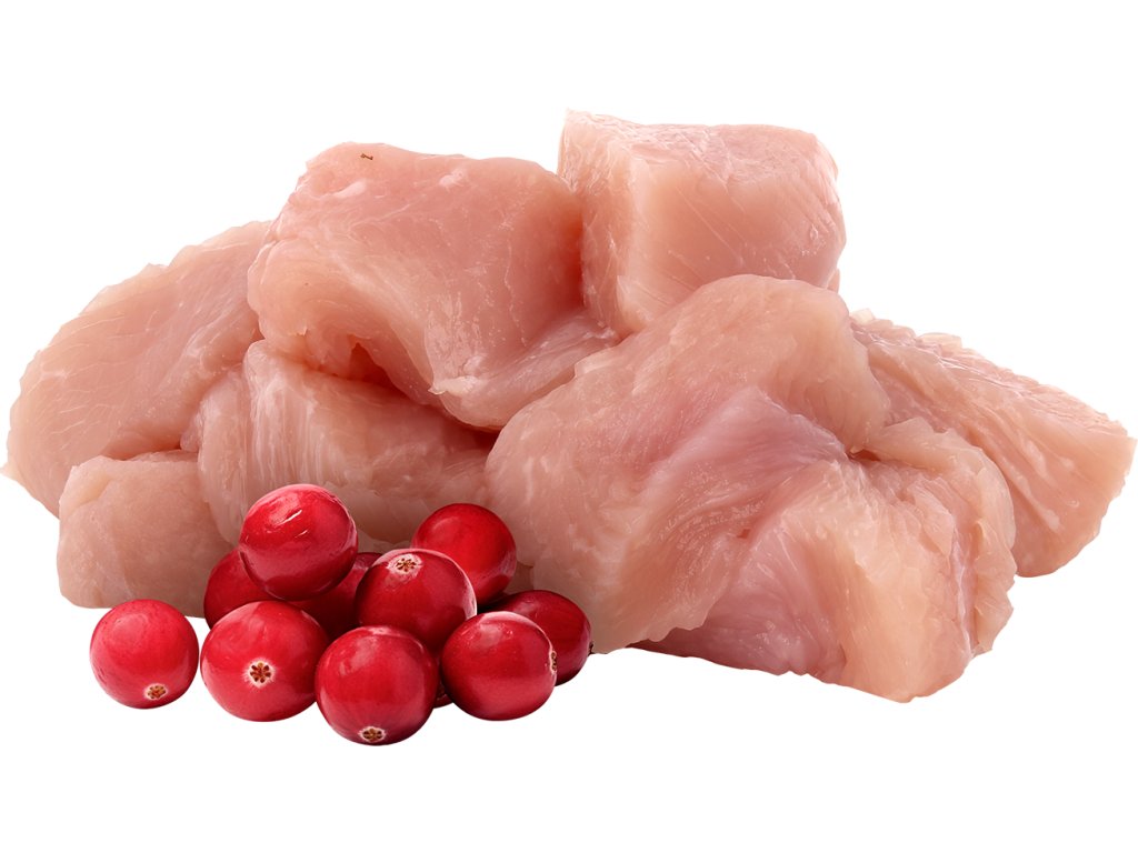 maso a vedlejší výrobky živočišného původu (kousky masa 88 %, z toho krůtí maso 11,6 %), minerální látky, hrachový škrob, hrachová bílkovina, inulin z čekanky 0,4 %, lignocelulóza, sušené brusinky 0,1 % Analýza: hrubé bílkoviny 10 %, hrubé oleje a tuky 3,5 %, hrubé popeloviny 2,5 %, hrubá vláknina 0,7 %, vlhkost 81 % Doplňkové látky /kg: vitamin D3 (3a671) 160 LE/IU/UI, vitamin E 100 mg, zinek 10 mg, mangan 2 mg, měď 1,2 mg, jód 0,2 mg, taurin 520 mg, biotin 100 mcg