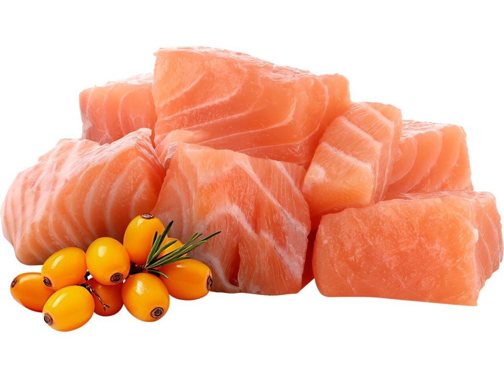 Složení: maso a vedlejší výrobky živočišného původu (kousky masa 73,5 %, z toho kuřecí maso 14 %), ryby a vedlejší výrobky z ryb (kousky lososa 14,5 %), minerální látky, lněný olej 1 %, hrachový škrob, hrachová bílkovina, inulin z čekanky 0,4 %, lignocelulóza, rakytník 0,1 % Analýza: hrubé bílkoviny 10 %, hrubé oleje a tuky 5 %, hrubé popeloviny 2 %, hrubá vláknina 0,3 %, vlhkost 80 % Doplňkové látky /kg: vitamin D3 (3a671) 160 LE/IU/UI, vitamin E 100 mg, zinek 10 mg, mangan 2 mg, měď 1,2 mg, jód 0,2 mg, taurin 520 mg, biotin 100 mcg