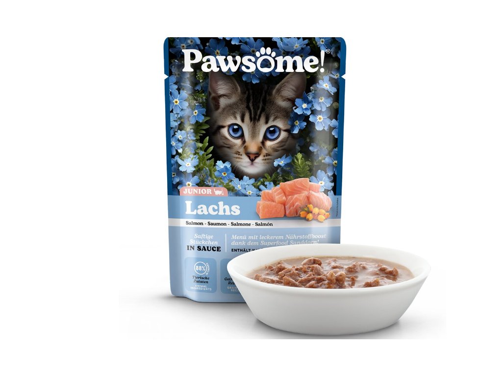 Šťavnaté měkké kousky s lososem a rakytníkem v lahodné omáčce jsou kompletním krmivem s vyváženým podílem bílkovin, tuků, vitamínů a minerálů, které přispívají ke zdravému vývoji a růstu mladých koček do 12 měsíců věku. Krmivo Pawsome! je vytvořeno tak, aby splňovalo očekávání i těch nejmlsnějších mazlíčků a zároveň zajišťovalo jejich zdraví, vitalitu a celkovou spokojenost. Jeho delikátní chuť, vůně a kombinace kousků masa a omáčky nabízí kočkám jedinečný chuťový zážitek a zároveň jim dodává živiny, nezbytné pro jejich každodenní dobrodružství.