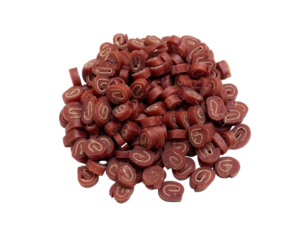 Masová pochoutka Rolka kachna s treskou mini je ideální tréninková odměna pro psy všech velikostí, zejména pro malé a střední psy. Díky mini provedení se skvěle hodí pro časté odměňování bez zbytečného zatěžování trávení.