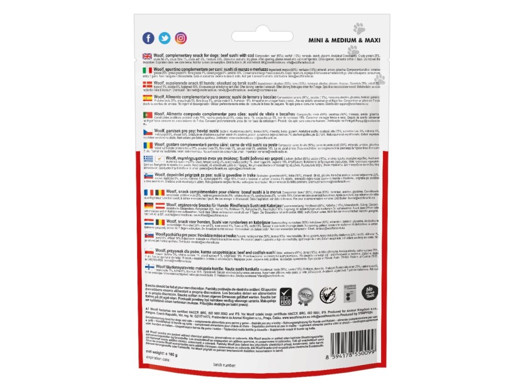 Pochoutky Woolf jsou vyráběny bez chemických přísad, konzervantů a barviv. Čerstvost je zachována pomocí absorbéru kyslíku.