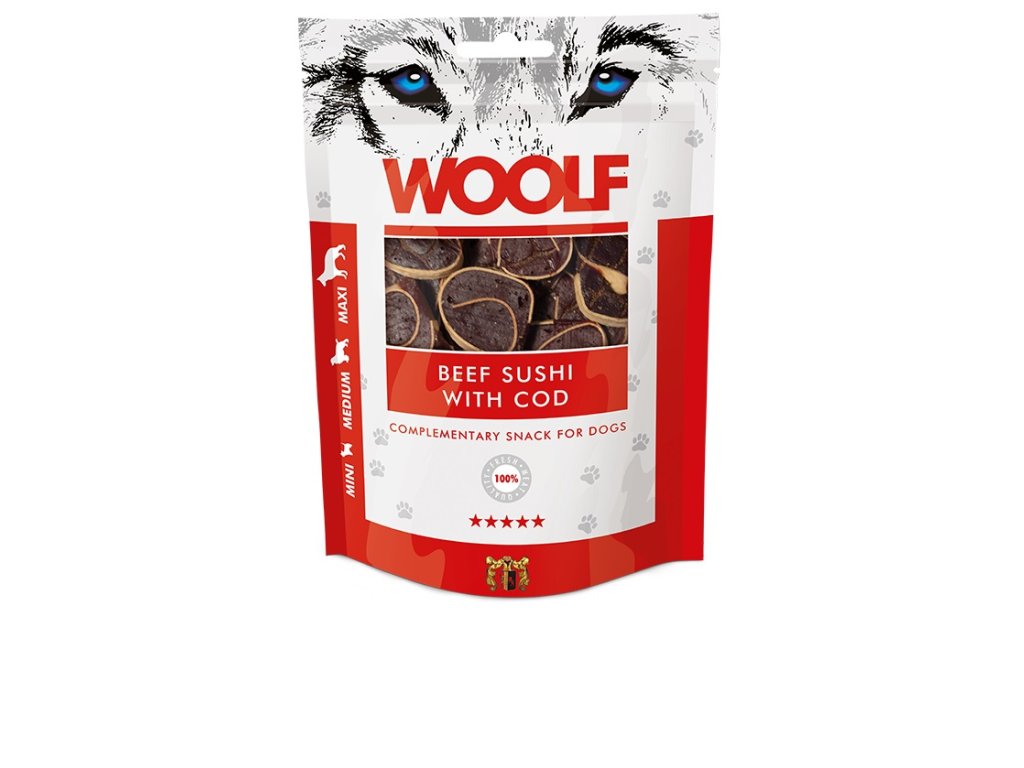 WOOLF Beef Sushi with Cod je lahodná masová pochoutka, která spojuje hovězí maso a tresku do chutné a snadno přijímané formy. Díky vysokému podílu masa je pamlsek přirozeně atraktivní i pro vybíravé psy a skvěle se hodí jako odměna při výcviku nebo jen tak pro radost.
