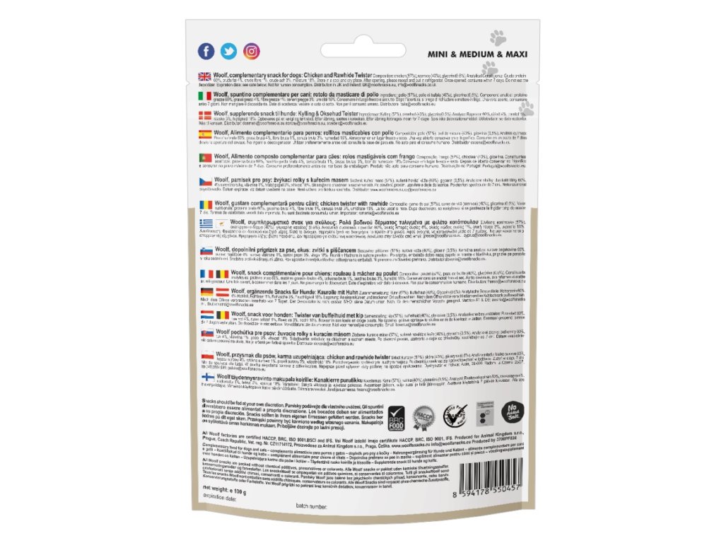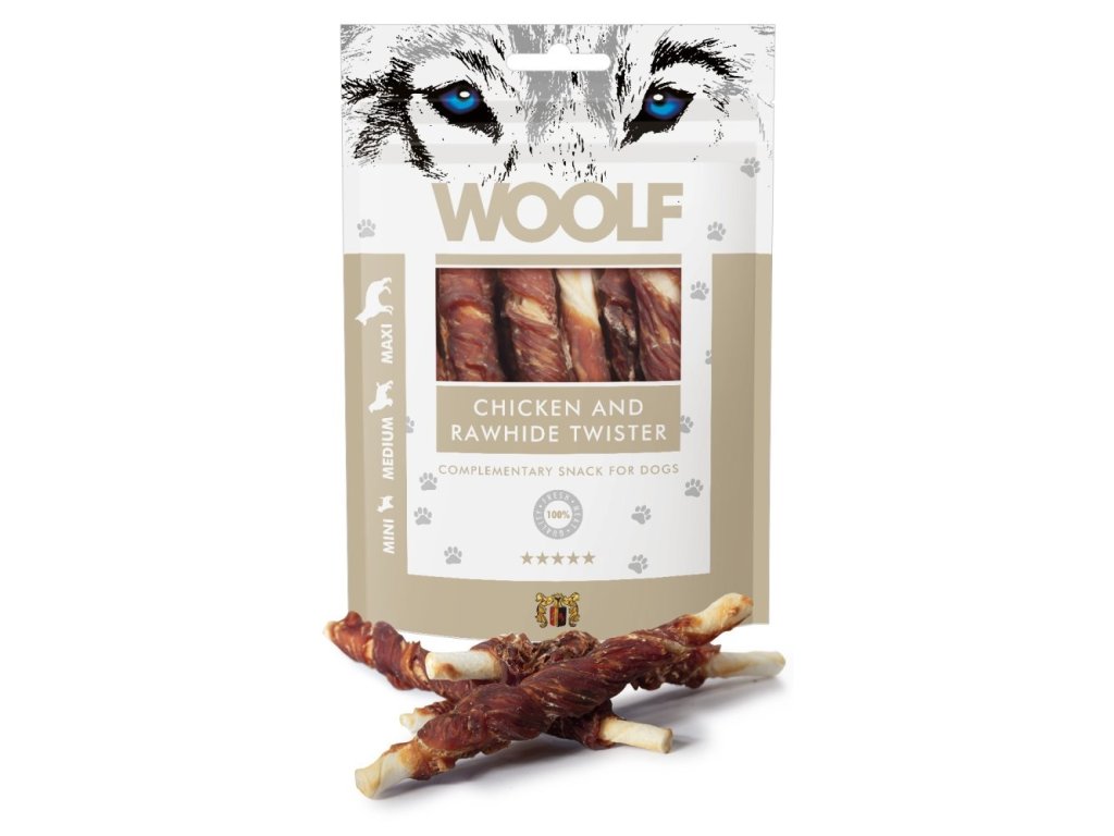 WOOLF pochoutka chicken and rawhide twister 100g 🐶 Pro všechny psy – vhodné pro štěňata, dospělé i seniory🍗 100 % kvalitní bílkoviny – kuře 57 %, hovězí kůže 40 %🦷 Podpora zdraví zubů a dásní – tvar rolky podporuje žvýkání a čistí dutinu ústní🌿 Bez chemie – žádné konzervanty, barviva ani chemické přísady🔒 Praktický obal – znovuuzavíratelný zip, absorbér kyslíku pro dlouhou čerstvost